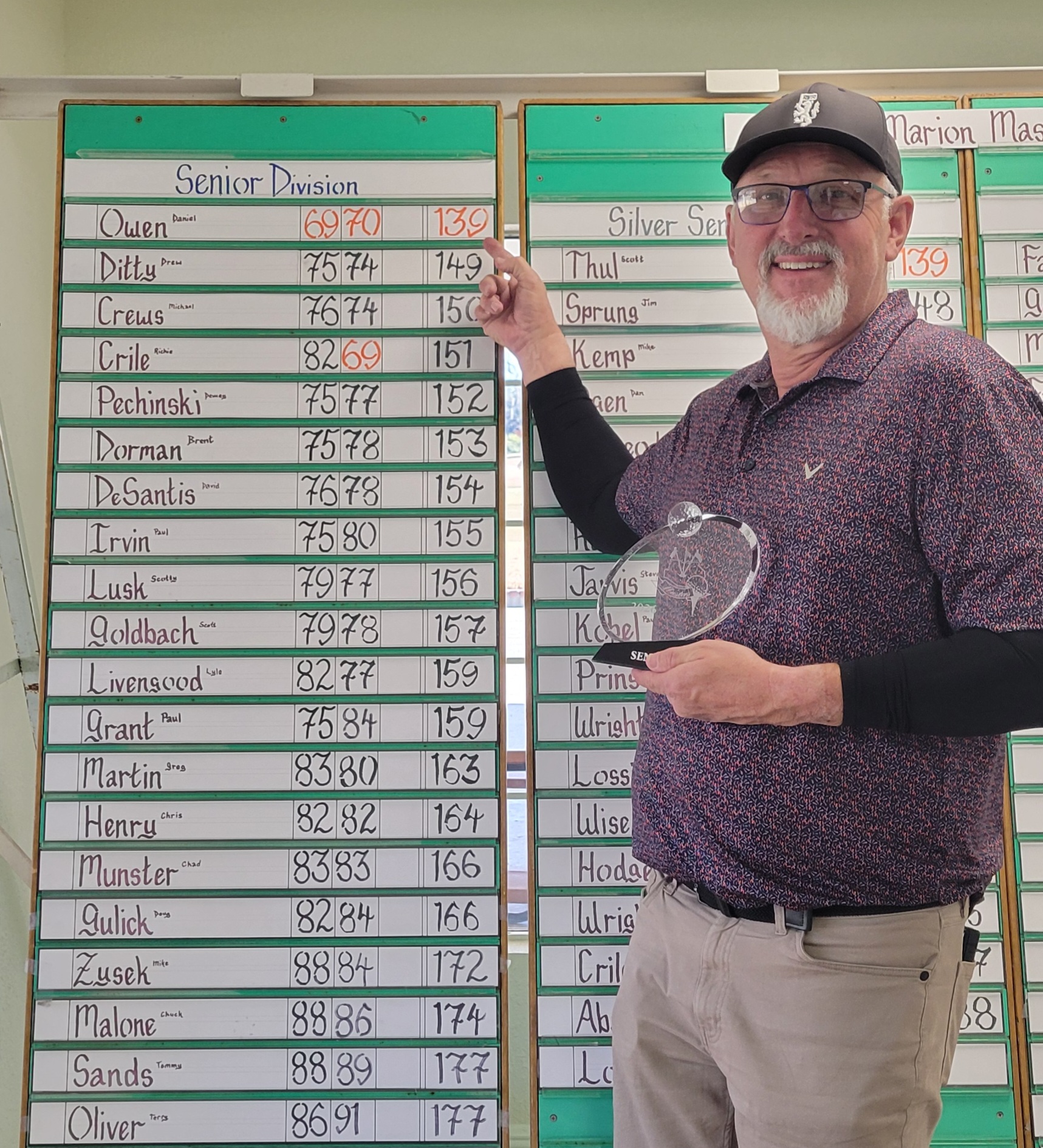 Scott Thul came from behind to win the Senior Division with a 3-under-par 141. Thul shot the only under-par round in his division a 3-under-par 69 which propelled him to a one shot win over last year’s champion Mike Zito and Daniel Owen. Zito and Owen both finished the event at 2-under-par 142. Bill Knapp ended up in fourth place on rounds of 71-72 for a 1-under-par 143 total. Paul Irvin ended up in fifth place with a 146 total..